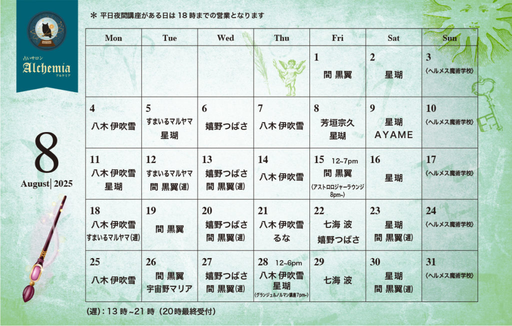 アルケミア8月の先生の登壇日をお知らせいたします。