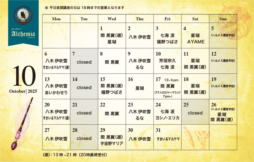 アルケミア10月の先生の登壇日をお知らせいたします。 ※(遅)遅番は13時〜21時(20時最終受付)です。※追加登壇・変更になる可能性もございます。ご了承くださいませ。 ※平日夜間に講座などがある場合は鑑定は18時で終了