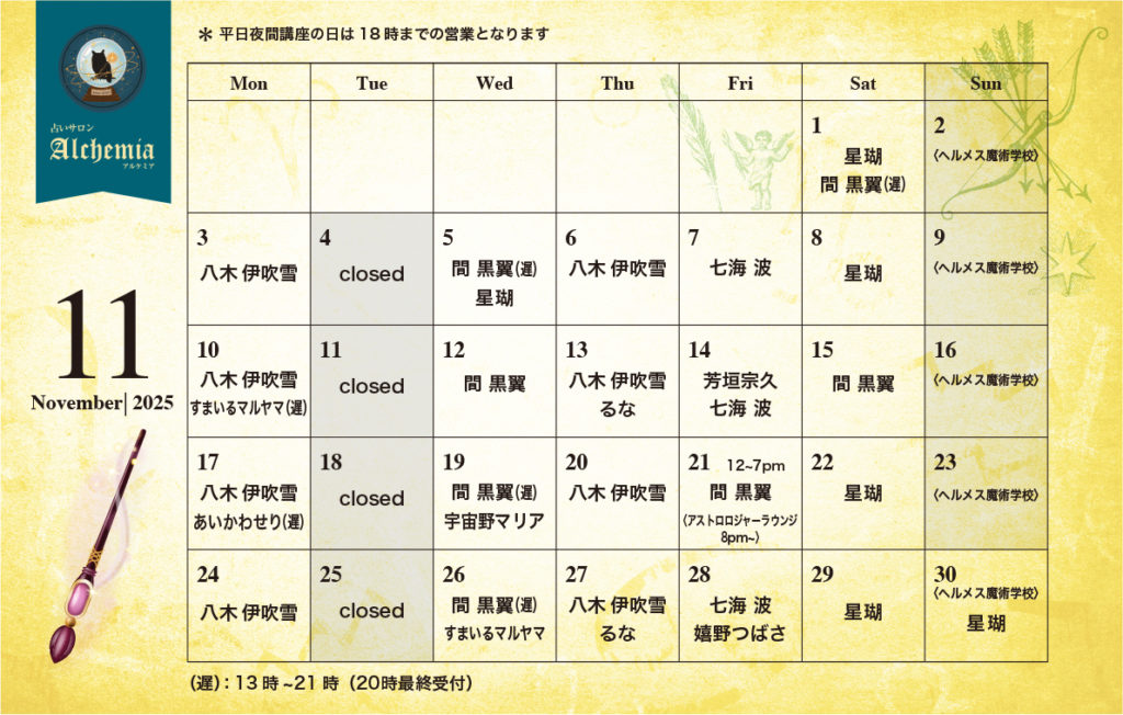アルケミア11月の先生の登壇日をお知らせいたします。 ※(遅)遅番は13時〜21時(20時最終受付)です。※追加登壇・変更になる可能性もございます。ご了承くださいませ。 ※平日夜間に講座などがある場合は鑑定は19時以前で