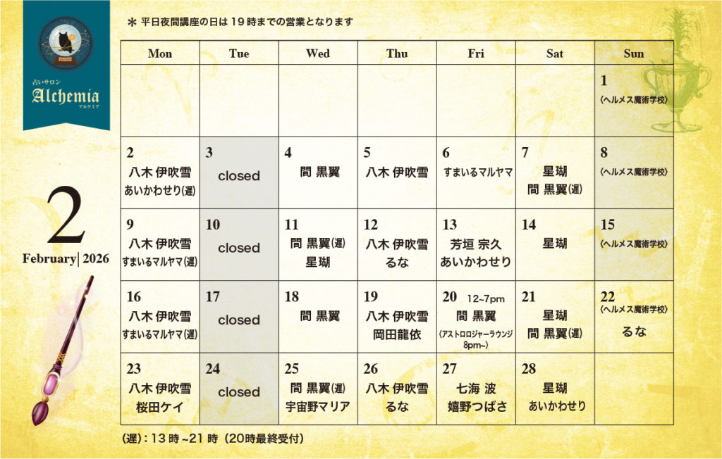 アルケミア2月の先生の登壇日をお知らせいたします。 ※(遅)遅番は13時〜21時(20時最終受付)です。※追加登壇・変更になる可能性もございます。ご了承くださいませ。 ※平日夜間に講座などがある場合は鑑定は19時以前で終 […]